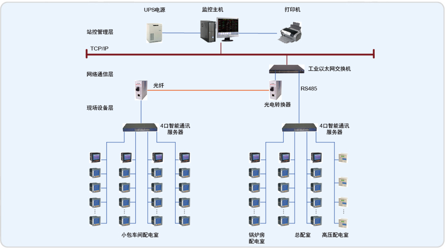 廠區配電中心為本項目提供一套高、低壓后臺監控系統,將廠區3臺變壓器的各主進線柜、出線柜、各低壓回路的開關配多功能智能儀表。能進行用電量計量;實時測量相電壓、線電壓、有功功率、無功功率、視在功率、功率因數、頻率等數據,能打印月度用電報表,并有歷史曲線的查詢(時間不小于30天),重要回路需要對其諧波進行測量。各參數及數據通過RS485總線,通過網絡送至配電中心的電工值班室(后臺監控中心)。電力監控組態軟應具有方便、靈活的開發環境,提供各種工程、畫面模板, 高性能實時、歷史數據庫,支持報警、事件網絡數據斷線存儲,恢復功能;提供的報表操作函數集、支持復雜腳本控制,包括:腳本調用和事件腳本,可以提供報表設計器,可以設計多套報表模板。