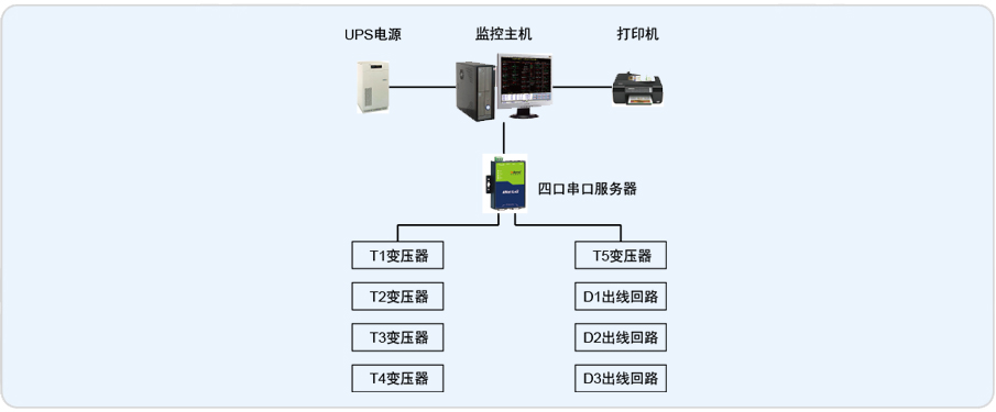 本項目為武漢愛機汽車配件有限公司變電所改造項目。根據配電系統管理的要求,需要對武漢愛機汽車配件有限公司3個變電所內的8個低壓配出線進行電力監控,以保證用電回路的安全、可靠和高效的運行。監測范圍具體為T1、T2、T3、T4、T5、D1、D2和D3共8個變壓器的進線柜側儀表進行遠程實時監控和電能管理。該系統總計有8只儀表,分2條總線,都是直接通過屏蔽雙絞線走管道拉至值班室連接到串口服務器上,實現總線上儀表與監控主機的數據連通。