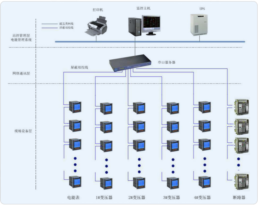 系統(tǒng)應(yīng)通過(guò)多功能的電力監(jiān)控裝置、通訊網(wǎng)絡(luò)和計(jì)算機(jī)軟件,實(shí)現(xiàn)醫(yī)院內(nèi)供配電系統(tǒng)在運(yùn)行過(guò)程中的數(shù)據(jù)采集、運(yùn)行監(jiān)視、事故預(yù)警、事故記錄和分析、電能質(zhì)量檢測(cè)、三相不平衡監(jiān)視、繼電保護(hù)等,完成醫(yī)院的安全供電、用電管理、設(shè)備管理和運(yùn)行管理。系統(tǒng)由主控層、通訊管理層和現(xiàn)場(chǎng)控制層構(gòu)成。系統(tǒng)要求盡量減少集中采集數(shù)據(jù)的裝置以保證系統(tǒng)的通訊可靠性。