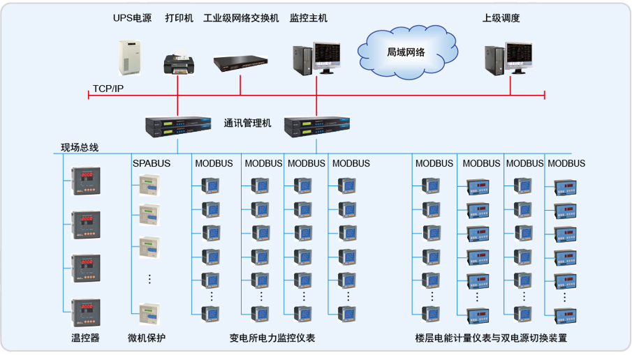 整個(gè)系統(tǒng)采用網(wǎng)絡(luò)分布式結(jié)構(gòu),監(jiān)控主機(jī)位于地下一層變電所值班室內(nèi),各變電所配電柜內(nèi)安裝有本公司ACR230ELH、ACR220EFLK儀表共計(jì)200多回 路。系統(tǒng)采用開放的通訊協(xié)議,通過(guò)現(xiàn)場(chǎng)總線與高低壓配電系統(tǒng)、變壓器溫控裝置、發(fā)電機(jī)的智能接口、ATSE及EPS等相連,實(shí)現(xiàn)數(shù)據(jù)通訊功能。同時(shí)監(jiān)視系統(tǒng)提供標(biāo)準(zhǔn)的RS485接口向上連接到BMS系統(tǒng)。